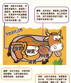 也称为草肚,是牛最大的胃,位于腹腔左侧,占据全胃容积的约80%。瘤胃的主要功能是暂时储存食物,并通过其中的微生物发酵分解纤维素等难以消化的有机物,使其变得易于吸收利用。发酵过程中产生的气体还会通过打嗝的方式排出体外。
