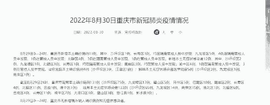 新冠肺炎2024年5月12日,重庆市新增新冠肺炎本土确诊病例2例、本土无症状感染者1例,均为市外感染者的密切接触者。