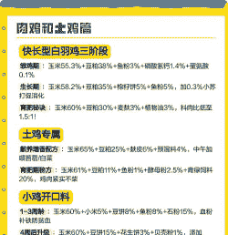 这些配方提供了不同生长阶段鸡所需的营养成分,包括蛋白质、能量、维生素和矿物质。在实际应用中,可以根据鸡的具体情况和饲养环境进行调整。