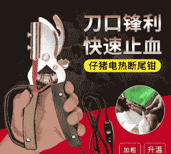 电热断尾钳描述:电热断尾钳是一种专门用于仔猪断尾的手术钳,通过电加热达到快速断尾和消毒止血的目的。使用前需要预热5-10分钟,将仔猪的尾巴放在断尾钳的半圆口中,利用高温钳断,随后使用钳子烫一下创面以达到止血和消毒的效果。