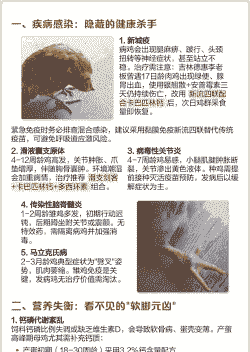疾病病毒性疾病:如新城疫、马立克氏病、禽脑脊髓炎、传染性脑脊髓炎等。