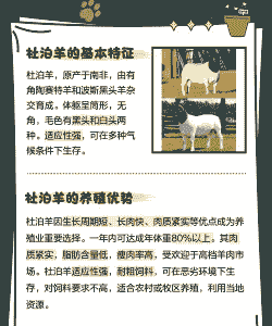 杜泊羊特点:适应性强、既耐热又抗寒、生长发育快、耐粗饲、繁殖性能好,但容易感染寄生虫。