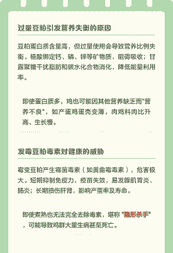 需要注意的是,虽然豆粕具有诸多优点,但过量使用可能导致雏鸡粪便粘着肛门、爪垫炎等问题,因此建议在使用豆粕时要控制用量,并根据鸡的不同生长阶段和需求进行合理搭配。此外,生豆粕含有抗营养因子,应经过加热处理后再使用,以避免影响鸡的健康和生长。