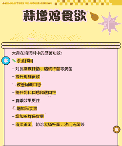 增进鸡群食欲大蒜具有浓烈的气味,可以提高不爱吃食的鸡群的采食量。在每日鸡饲料中按照合理比例添加大蒜,一般使用量为3%左右,这样可以有效改善饲料的适口性。