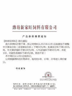 2024年11月受饲料原料价格下降影响,河南正本清源、世纪正航饲料、华美明盛农牧、邦农饲料等多家饲料企业宣布饲料降价50-200元/吨。