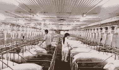 规模化养殖模式以从国外引进的杜洛克、长白、大约克三品种猪杂交获得的三元商品猪为主流,具有瘦肉率高、生长速度快、饲料转化率高等优势。