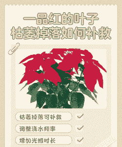 一品红的叶子枯萎掉落补救方法是首先需要给予一品红温暖而通风的生长环境,并且防止它的盆内水分过大,从而引起发黄脱落的现象。其次需要给一品红使用肥沃的沙质土进行生长,并且在土壤的底部加入一些有机肥。最后还需要给予一品红充沛的散光照射,并且在生长期间,做好修剪和水肥管理,这样才能使一品红重新长出新的叶片。