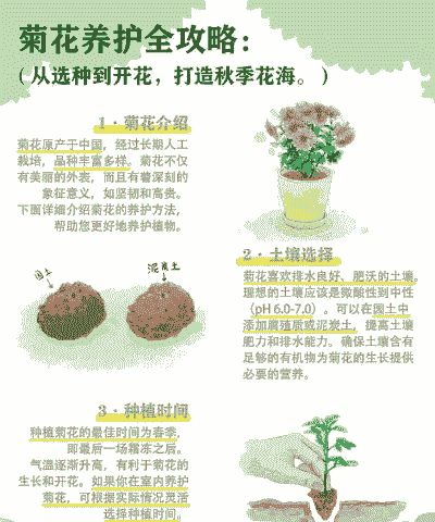 菊花是季节性花卉,其生长和开花与季节变化密切相关。在春季和夏季,应着重于植株的生长和养护,为秋季的开花打好基础。到了秋季,要密切关注花蕾的发育情况,及时调整养护措施,确保菊花能够如期绽放。在冬季,要做好保温工作,防止菊花受冻害。
