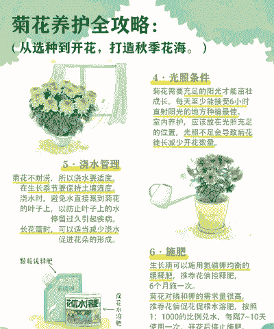 菊花在生长期间需要充足的水分和营养。浇水时,应遵循“见干见湿”的原则,避免积水造成根部腐烂。在施肥方面,生长期可以每隔半个月施加一次复合肥,以促进植株生长;花蕾形成后,应增施磷钾肥,以促进花蕾发育和开花。