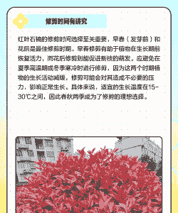 用于修剪的刀具一定要选择刀口锋利,而且是经过清洗消毒过的,不然细菌会通过切口钻入植株造成二次伤害。修剪时若有芽点在枝条上,则应当在距离芽点8~10厘米的地方动刀,不然会对红叶石楠的新芽生长造成影响