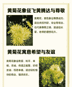 黄菊花的花语和寓意有怀念、悼念、坚强、单相思、清静、优雅绅士、高洁之士、高雅尊敬。黄菊花还有代表清淡飘逸的处世风格,通常用来形容那些与世无争,喜欢清静之人,所以不少文人墨客都喜欢借菊抒情,表达自己的情怀。