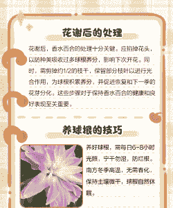 香水百合的残花和枯枝烂叶虽然已经剪除,但是其球茎仍然生存于土壤中,需要吸收充足的水分以供发育,因此要在土壤干燥后立即补一次水,保证土面微微湿润,浇水时注意控制水量,以免积水而烂球。