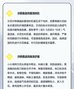 兰花适合在根系活力较低的时候,也就是开花以后发芽以前的这一段时间进行分株。之所以要在根系活力较低的时候分盆,是因为这样不容易伤到它的根系。因为不同品种的兰花开花时间不同,所以不同品种的兰花也有不同的最佳分株时间。冬季开花的品种可以在早春分株。夏季开花的品种可以在初_秋分株。