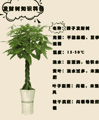 1、光照管理:它耐阴性虽好,但室内光线要充足;2、温度管理:低于15℃要在室内越冬,夏天忌阳光暴晒;3、水分管理:发财树耐旱,夏天20天浇1次;4、施肥管理:春秋季以绿叶肥为主,冬季禁肥;5、冬天忌冷风吹;6、换盆忌土球散块。