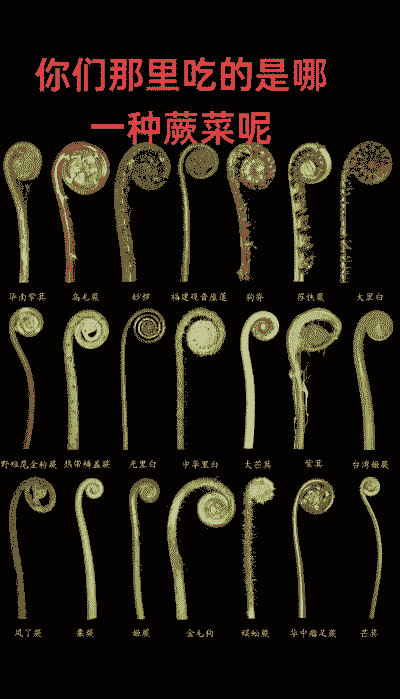 蕨菜的种类繁多,不同地区根据形态、生长环境和用途有不同的分类。以下是几种常见的蕨菜种类及其特点: