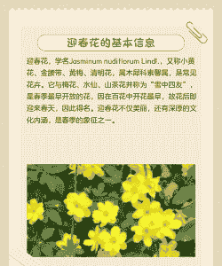 迎春花的别称和雅称是小黄花、金腰带、黄梅、清明花等。迎春花,花色金黄,叶丛翠绿,素雅端庄,气质非凡。冬末春初,先花后叶,不惧严寒,不择风土,生命力和适应性很好,历来为人们喜爱。木犀科素馨属落叶灌木。花期2一4月。