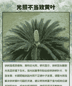 环境不适铁树喜阳光充足、湿润的环境,但忌烈日暴晒(尤其是新叶期需遮阴)。长期处于阴暗环境会导致光合作用不足,叶片发黄。