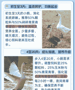 挑选雏鹅:挑选健壮的鹅苗,特征包括卵黄吸收好、脐部收缩完全、腹部松软、腿部粗壮有力、体重适中、精神活泼、眼睛有神。