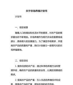 农村养殖计划书是一个详细的文档,用于描述养殖项目的各个方面,包括项目背景、市场分析、养殖技术、市场营销策略、投资预算和回报分析等。以下是一个基本的框架,可以帮助你撰写农村养殖计划书: