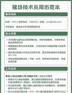 养殖简历的撰写需要突出个人的专业背景、工作经验和技能,以下是一个养殖简历的基本模板和要点,供您参考: