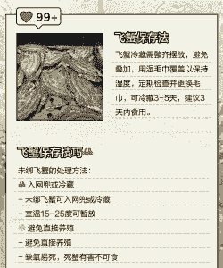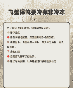 保存方法:新奇的飞蟹可以放入冰箱冷藏,并盖上湿毛巾;也可以放在装水的桶里,注意不要叠放,水不能没过蟹。