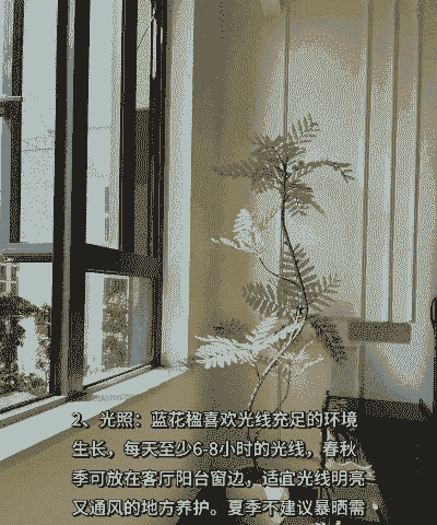 光照:蓝花楹喜阳光充足的环境,每天至少需要6小时的直射阳光。室内种植时,应选择靠近窗户的位置。