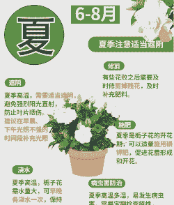 栀子花喜肥,但不宜过量。春、秋两季可每2~3周施一次稀薄饼肥水,现蕾后施2~3次速效性磷肥。夏季施肥宜淡,一般每半个月施一次。冬季进入休眠期,应停止施肥。