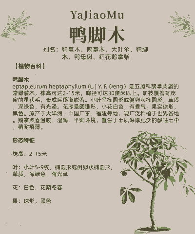 鸭掌木是热带、亚热带植物,适应的生长温度在15-25℃,不耐寒冷,低于5℃时会落叶。