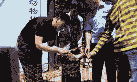 操作方法:将倒挂在屠宰架上的活孔雀绑定好,用双手将孔雀嘴掰开,另一个人用剪刀将舌根两侧静脉剪断,使血流出,沥血3~4分钟即可死亡。此方法颈部完整美观,但操作难度大,有时沥血不净。