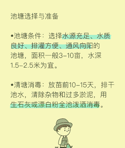 鱼种放养前半个月,用生石灰彻底清塘消毒,或用食盐水和漂白粉浸泡鱼苗20分钟。