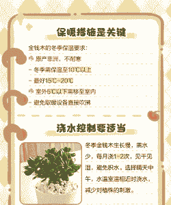 金钱木不耐寒,冬季养护温度要控制在10℃以上。如果温度低于10℃,则需断水保命;如果温度能保持在20℃以上,金钱木可以正常生长。