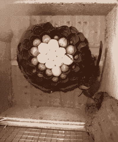 人工辅助筑巢是在自然条件下建筑蜂棚。春季气温恒定在13℃时,越冬胡蜂开始散团活动,可在夜间移入大棚中,轻开笼门或箱盖,来日胡蜂即在棚内飞翔。气温恒定在17℃以上时,蜂开始进入筑巢产卵阶段,应随时观察,见有蜂在棚顶及四周纱网上时飞时停,应及时将蜂笼挂在棚内各处,将笼开启一半而拴牢。在蜂棚内放上腐朽木材,棚壁纱网上挂些废纸条,备蜂取用。第1个巢室建好后,后蜂便在巢室近底部侧壁产下1粒带短柄的蜂卵。蜂卵孵化前,后蜂会很快在位于巢柄下第1巢室侧面接圆周状巢室,边建边产卵,直至卵粒依次孵化。后蜂不断产卵,同时担负外出觅食和饲育幼蜂的任务。巢体不断扩大,幼蜂随之增加,此时要特别注意饲料的供应。