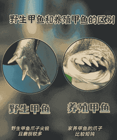 人工养殖甲鱼:爪子短小且钝,甲壳较软,用手指抵压腹甲反弹力弱。