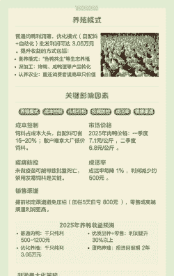 综上所述,广东养殖鸭子的利润情况较为乐观,尤其是规模化养殖和深加工可以显著提高利润空间。建议养殖者根据自身实际情况选择合适的养殖规模和经营模式,以实现最佳的经济效益。