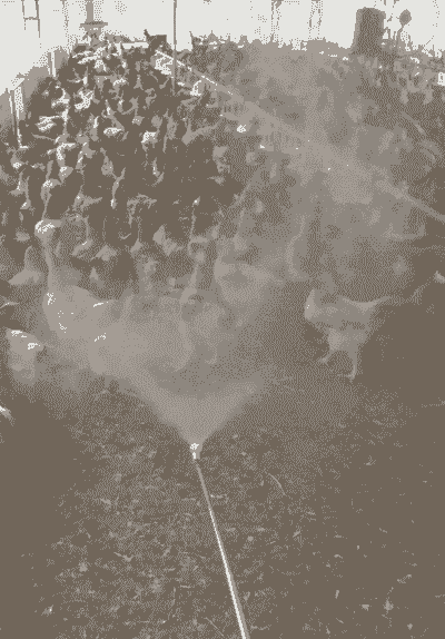 喷雾消毒:使用化学消毒剂,安装人工喷雾,对鸡舍四面墙、地面、饲料槽、地面周围圈、操场和活禽市场、鸡体表面、车辆等进行消毒。