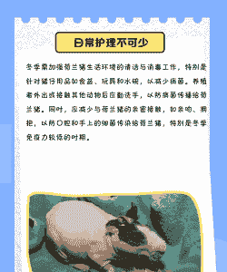 清洁:荷兰猪爱干净,需要定期洗澡,夏天使用温水,冬天注意保暖。洗澡后要及时擦干毛发,避免感冒。