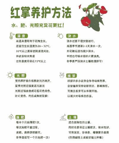 红掌生长过程中需要充足的养分,但冬季生长速度减缓,应适当减少施肥量。温度低于10℃时,可以停止施肥。