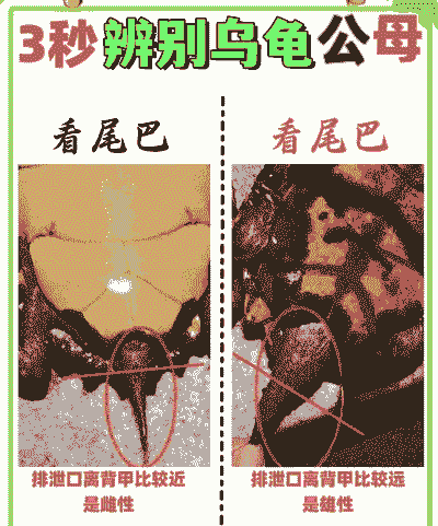 雄龟的排泄孔位置在尾端,形状较长;雌龟的排泄孔位置在腹甲处,形状呈圆形。
