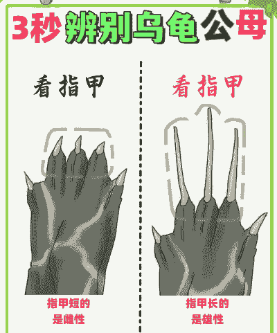 雄龟的指甲较长,有凹陷;雌龟的指甲较短,较平坦。