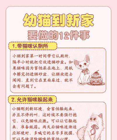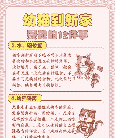 安全的环境:确保家中没有对小猫构成威胁的物品,如电线、尖锐边角、易碎品等。使用安全门栏或婴儿围栏限制小猫的活动范围,直到它们学会避免危险。
