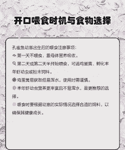 小鱼苗出生后头一天不用喂食,让卵黄囊吸收完毕后再进行投喂。初期食物可以是洄水或熟蛋黄,用纱布包裹后轻捻到水中。