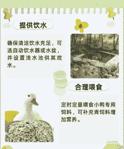 保暖措施:对于刚出壳的雏鸭,需要提供保暖效果好的圈舍,可以使用塑料泡沫箱子,并在箱子上部挂白炽灯泡以提供适宜的温度。
