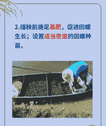 田螺放养密度:一般每平方米放养100-120个,同时,每平方米套养夏花鲢鳙鱼种5尾左右进行主体养殖。田螺放养时间一般都在3月份。