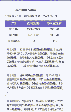 - 固定成本: 包括种子(30-60元/亩)、化肥(100-200元/亩)、农药(30-50元/亩)、机械费(300-600元/亩)及土地租赁费(300-500元/亩)。 - 可变成本