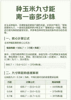 三、种植密度计算计算公式: 株距(米)= 667平方米 / 平均行距(米) / 亩留苗数 示例