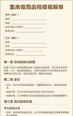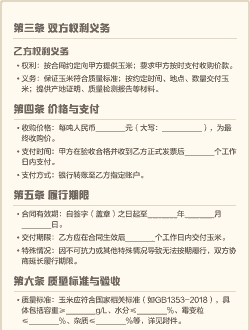 - 未按时付款或拒收合格玉米,需支付违约金(如合同金额的 [X]%)。 - 延长收购期导致玉米品质下降,需承担全部损失。#### 六、其他条款