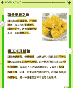 - 甜玉米:含较少支链淀粉,更多可溶性糖(6%左右),甜度高但饱腹感较弱。