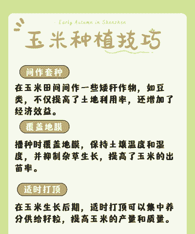 光照: 玉米为短日照作物,需8-12小时光照促进开花,但不同生育期对光照强度要求不同。 土壤管理