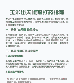 :除草剂后10天左右需喷施杀虫剂(如粘虫剂)和杀菌剂,防治玉米螟、锈病等 二、其他注意事项天气与安全