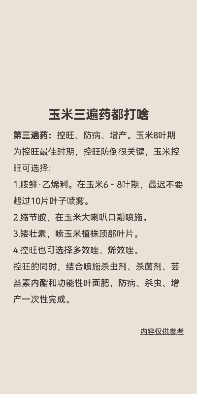 通过以上分阶段施药,可有效控制杂草生长,同时减少对玉米苗的伤害,保障产量与品质。